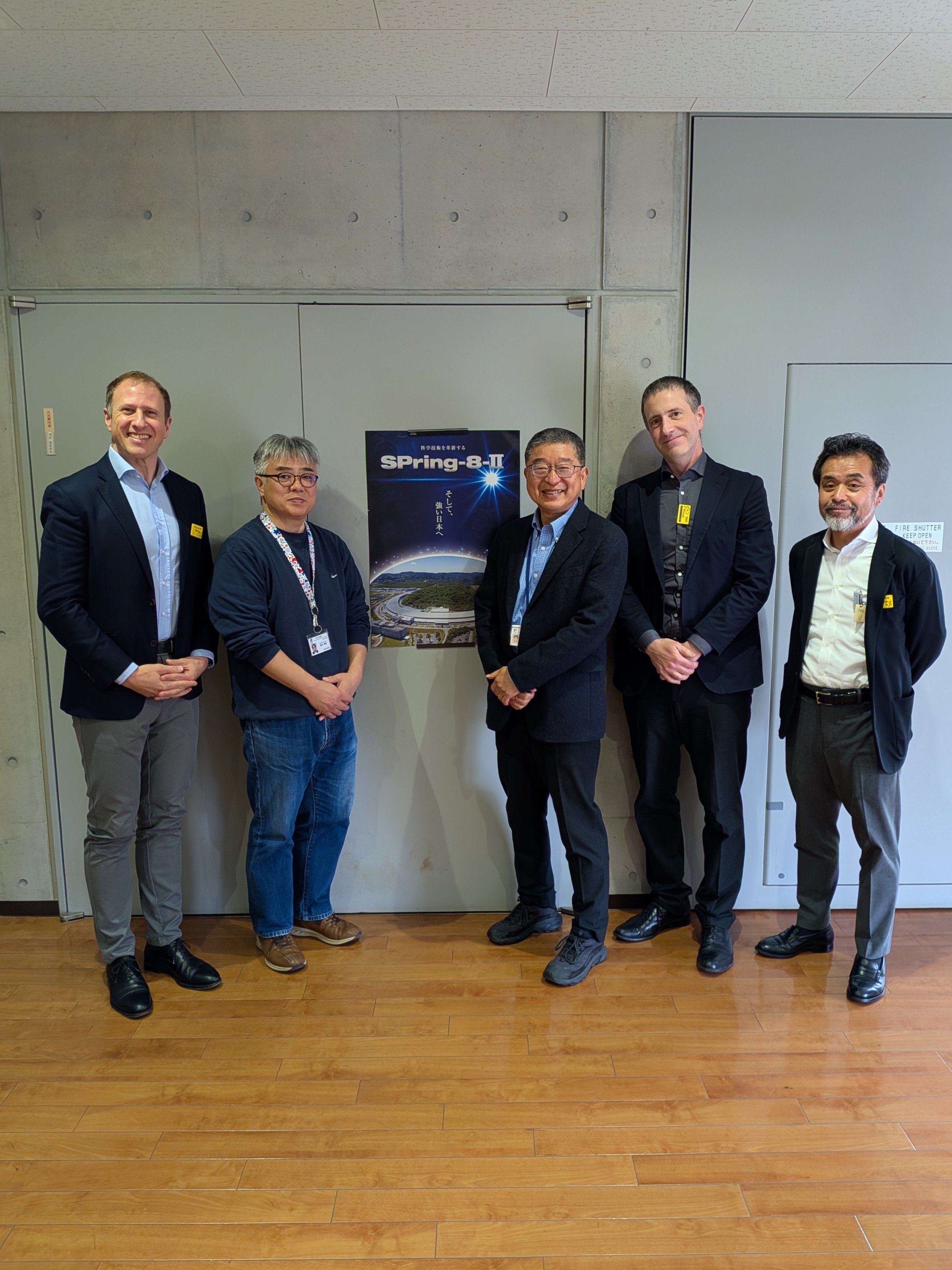 A photo from DECTRIS Japan's visit to SPring-8: Dr. Stefan Brandstetter, CCO of DECTRIS; Dr. Nobutaka Shimizu, Life Science Research Infrastructure Group Director at RIKEN SPring-8 Center; Dr. Masaki Yamamoto, Division Director at RIKEN SPring-8 Center, and President of the Japanese Society for Synchrotron Radiation Research; Dr. Leonard Chavas, Representative Director DECTRIS Japan; Dr. Takeyoshi Taguchi, Senior Advisor DECTRIS Japan