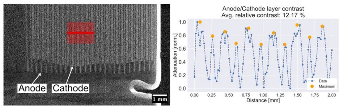 The study shows how optimizing the position of the energy thresholds in DECTRIS photon-counting detectors can significantly improve micro-CT image quality in dynamic, at-line and in-line battery R&D and inspection. This allows defects like winding inaccuracies or particle contamination to be identified within seconds, bringing synchrotron-like performance to laboratory and production environments. Such capabilities are essential for advancing electric vehicle battery safety, quality and manufacturing efficiency.
